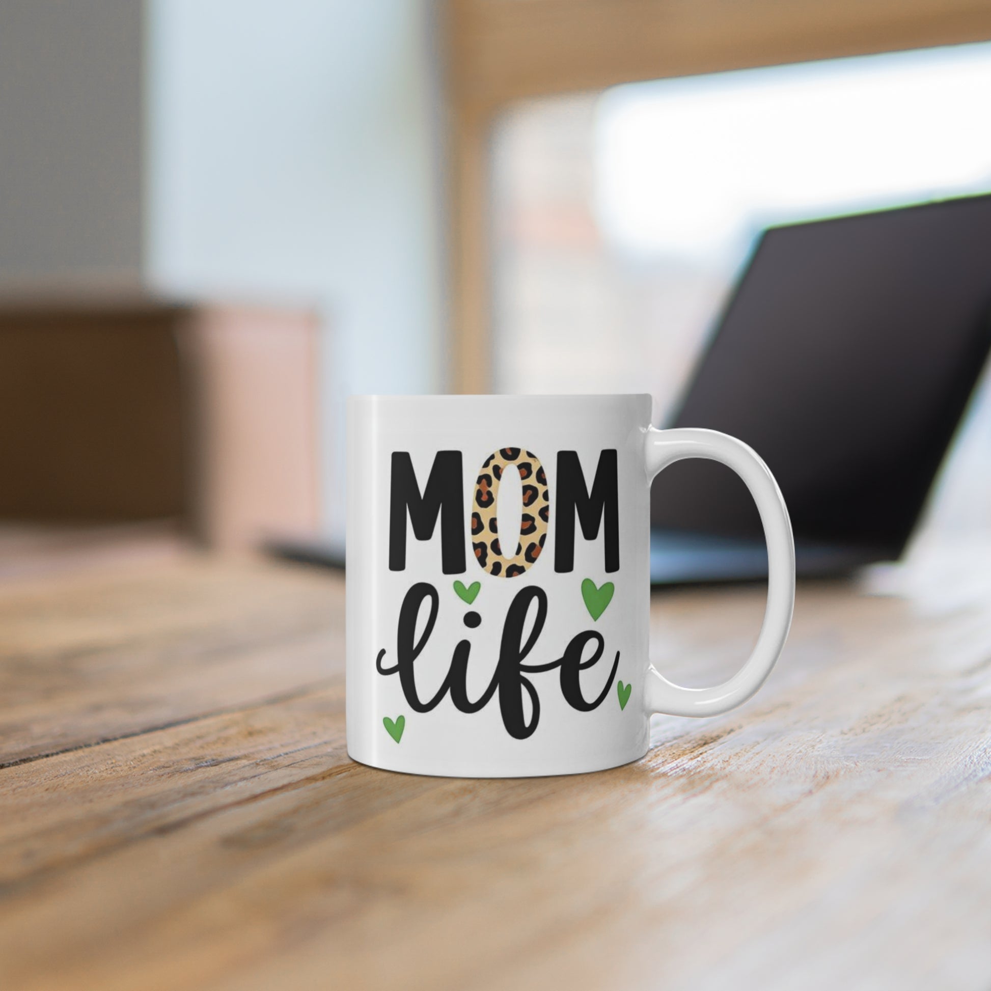 This adorable two-sided white ceramic mug features a fun Mom Life design with a trendy leopard print detail and cute green hearts. It’s perfect for morning coffee, afternoon pick-me-ups, or those quiet moments you sneak in just for yourself.